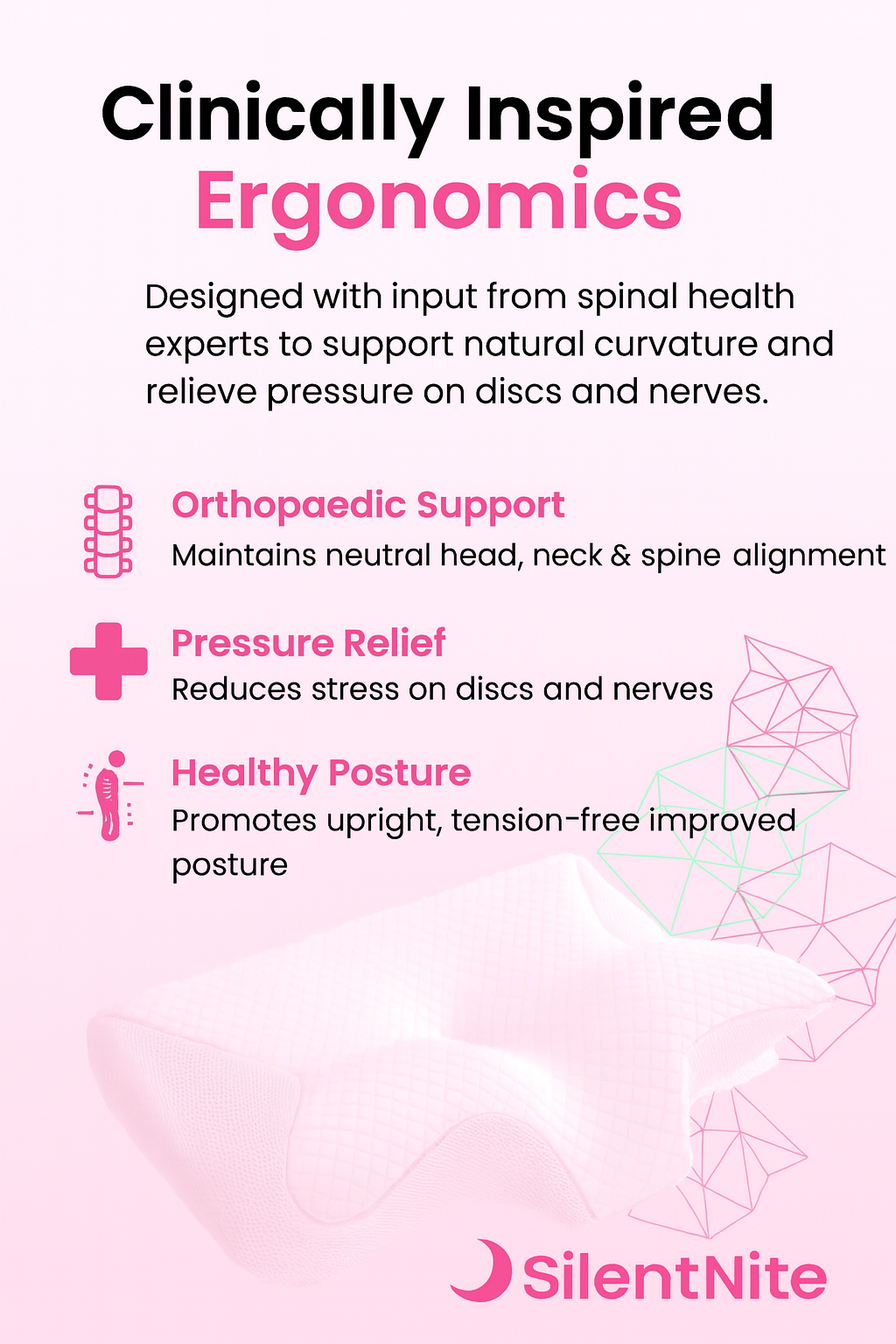 Our Silent Nite pillow features an ergonomic butterfly contour that cradles your neck’s natural curve. Made with high-density memory foam that gently adapts to your shape and regains its supportive form each night, it ensures lasting comfort and perfect alignment for head, neck, and shoulders.